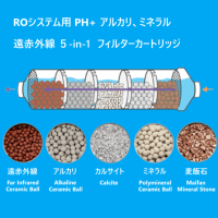 これ一本で、アルカリ性のミネラルウォーターが作れる、5種類のメディアが入った、5-in-1のインラインフィルターです。RO浄水器で生成された浄水を更にこのフィルターに通すことにより、RO水がミネラルウォーターになります。